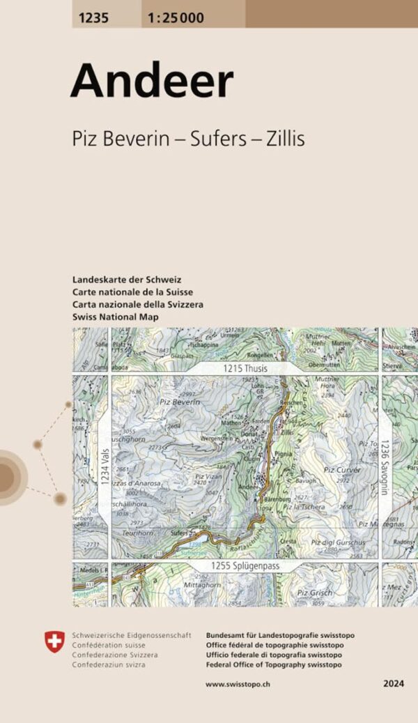 Kaarten en gidsen > Wandelen > Wandelkaarten > Europa > Zwitserland en Oostenrijk (en Alpen als geheel) > Zwitserland > Graubünden > topografische wandelkaart CH-1235 Andeer [2024]