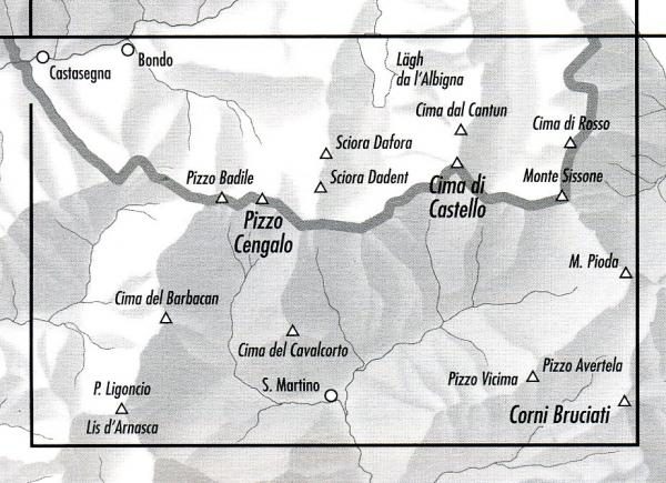 Met Sentiero Roma (niet ingetekend); Bergell, San Martino, Val di Mello, Cima di Castello, Pizzo Badile