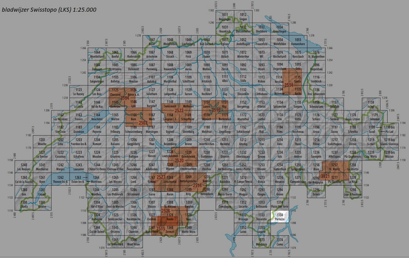 Topografische wandelkaarten van Zwitserland (Landeskarten der Schweiz), schaal 1:25.000. Kwalitatief zeer goed. Leent zich uitstekend voor het maken van wandeltochten en klimtochten, ook in hoog alpien terrein. Let wel, alle paden staan erop, maar géén gemarkeerde routes. Voor dat doel is met name de serie T-SERIE uitgegeven. Niettemin zijn deze 1:25.000 kaarten - wegens de sublieme cartografie en detaillering - perfecte wandelkaarten. De kaart zit in een door ons toegevoegd soepel transparant hoesje, ook handig tijdens het wandelen. | TIP: als je op de serienaam klikt verschijnen alle kaarten uit deze reeks, van deze regio, op nummervolgorde.