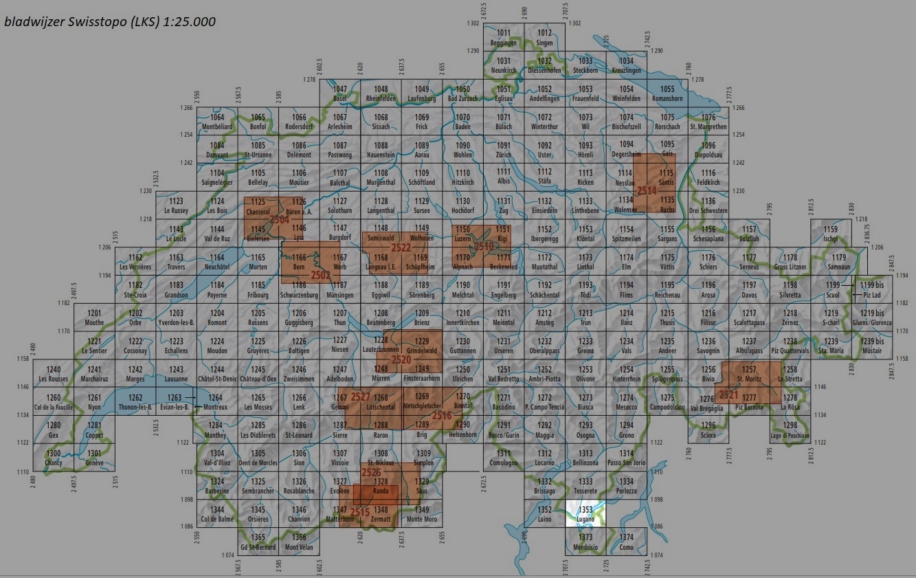 Topografische wandelkaarten van Zwitserland (Landeskarten der Schweiz), schaal 1:25.000. Kwalitatief zeer goed. Leent zich uitstekend voor het maken van wandeltochten en klimtochten, ook in hoog alpien terrein. Let wel, alle paden staan erop, maar géén gemarkeerde routes. Voor dat doel is met name de serie T-SERIE uitgegeven. Niettemin zijn deze 1:25.000 kaarten - wegens de sublieme cartografie en detaillering - perfecte wandelkaarten. De kaart zit in een door ons toegevoegd soepel transparant hoesje, ook handig tijdens het wandelen. | TIP: als je op de serienaam klikt verschijnen alle kaarten uit deze reeks, van deze regio, op nummervolgorde.