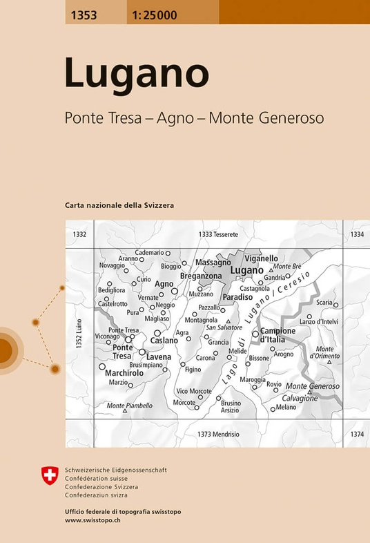 Kaarten en gidsen > Wandelen > Wandelkaarten > Europa > Zwitserland en Oostenrijk (en Alpen als geheel) > Zwitserland > Tessin, Ticino > topografische wandelkaart CH-1353 Lugano [2022]