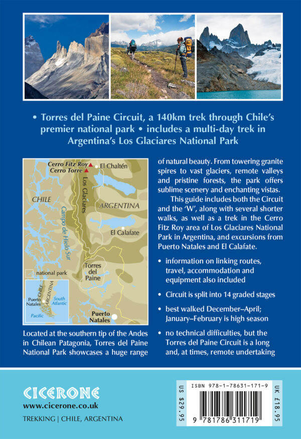 Wandelgids met o.m een routebeschrijving van een tiendaagse trekking om de Torres del Paine, een van ’s werelds mooiste wandelroutes. Ook inbegrepen zijn een kortere trektocht (4 tot 5 dagen), verdere trektochten en dagroutes in de nationale parken Torres del Paine en Los Glaciares en rond Puerto Natales. Bevat ook route-informatie t.b.v. het aan elkaar koppelen van de beschreven routes, evenals praktische details omtrent transport en verblijf. Engelstalig.