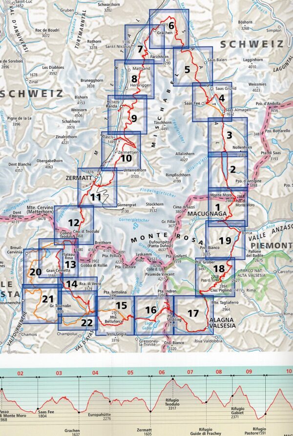 Atlasje met gedetailleerde kaarten (1:25.000). Het is gedrukt op het ijzersterke stonepaper. Deze route, de Tour de Monte Rosa, is 206 kilometer lang, over 10 etappes. Bovendien geeft het boekje nog wat varianten. Een alpiene route die slingert rond het Monte Rosa-massief dwars door de valleien tussen Piemonte, Zwitserland en Valle d'Aosta, langs de oude Walser-paden. Het is een van de meest schilderachtige en tot de verbeelding sprekende routes in de Alpen waar de reeks van imposante vierduizenders de horizon domineert.