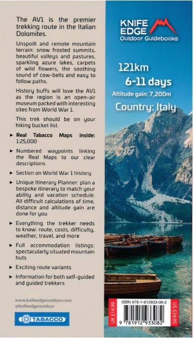 Een gids exclusief voor de AV1. Alles wat u moet weten om deze prachtige lange afstandsroute in de Dolomieten te plannen en te lopen, inclusief varianten. De gids bevat de echte Tabacco kaarten (dat wil zeggen, de mooiste en meest gedetailleerde kaarten van deze regio), dus die hoeft u niet meer aan te schaffen. Dit maakt het navigeren gemakkelijk. De kaarten tonen genummerde routepunten, die gekoppeld zijn aan de routebeschrijving. Alle moeilijke berekeningen van tijd, afstand en hoogtewinst zijn voor u gedaan. En verder geeft de gids alles wat de trekker moet weten om de route te plannen: routebeschrijvingen, kosten, budget, moeilijkheidsgraad, weer, hoe er te komen, en meer. Aangevuld met volledige accommodatielijsten, waarvan vele spectaculair gelegen berghutten. Ook campings worden genoemd. Mooi verzorgd en geïllustreerd, desondanks handzaam en lichtgewicht. De AV1 is de belangrijkste route in de Dolomieten. Het is de perfecte manier om de prachtige schoonheid van het gebied en de fascinerende WO1-geschiedenis te ontdekken.