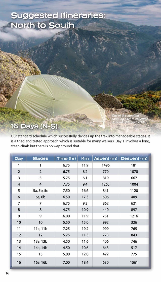 - 15 different itineraries: schedules of 9, 10, 11, 12, 13, 14, 15 and 16 days. Includes both northbound and southbound itineraries. Difficult calculations of time, distance and altitude gain are done for you.