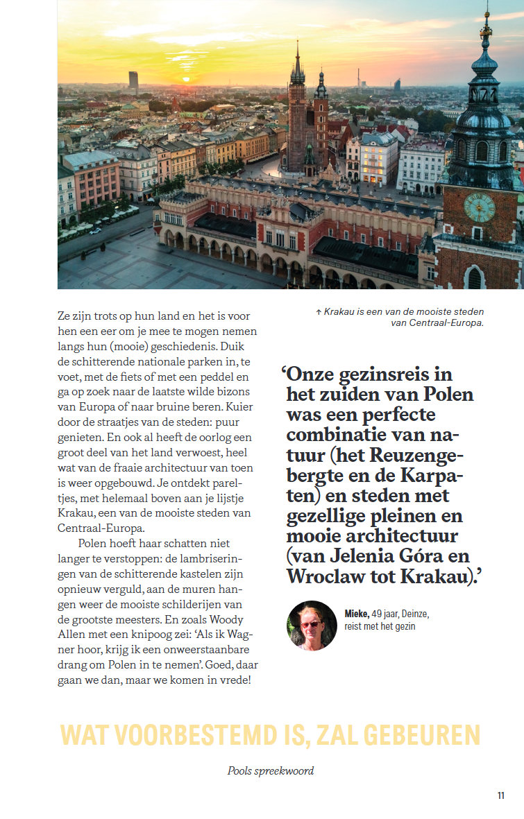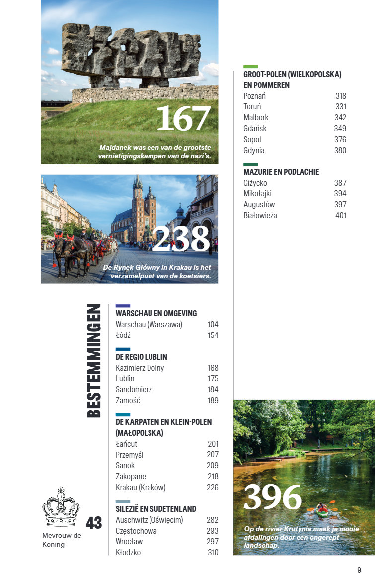 Polen is een veelzijdig land vol cultuur, geschiedenis en natuur. Krakau en Warschau bieden indrukwekkende historische bezienswaardigheden en tastbare herinneringen aan het verleden, terwijl steden als Lublin, Wroclaw en Torun elk een eigen karakter hebben. Door het hele land vind je kastelen, paleizen en bijzondere houten kerken. Ook natuurliefhebbers komen aan hun trekken in nationale parken, de Karpaten en het merengebied van Mazurië, ideaal voor rust en ontspanning.