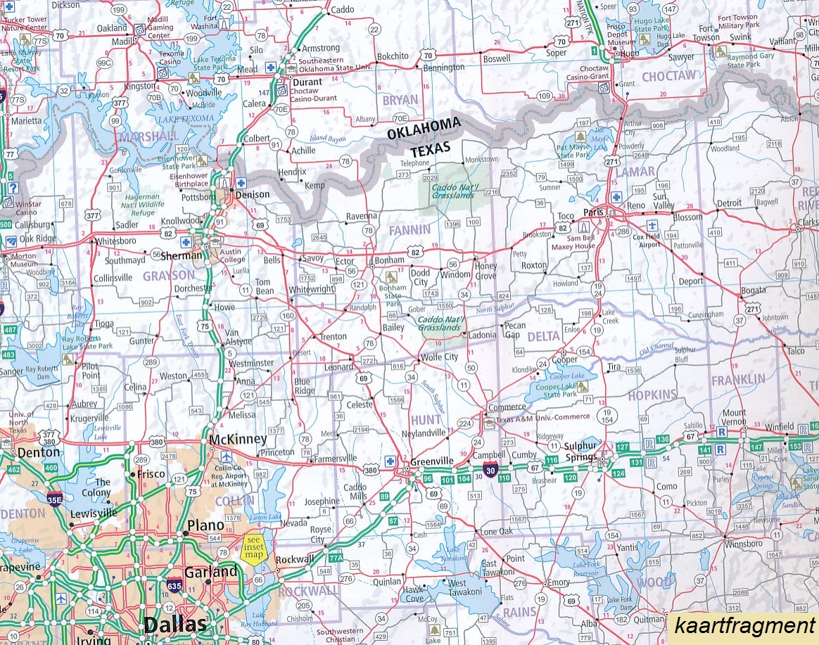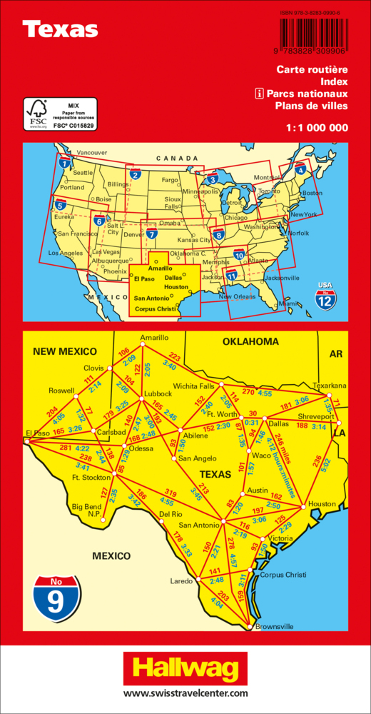 Wegenkaart met plaatsnamenregister, National Parks, Area & City Maps. Highlights Dallas, Houston, Rio Grande, Big Bend.