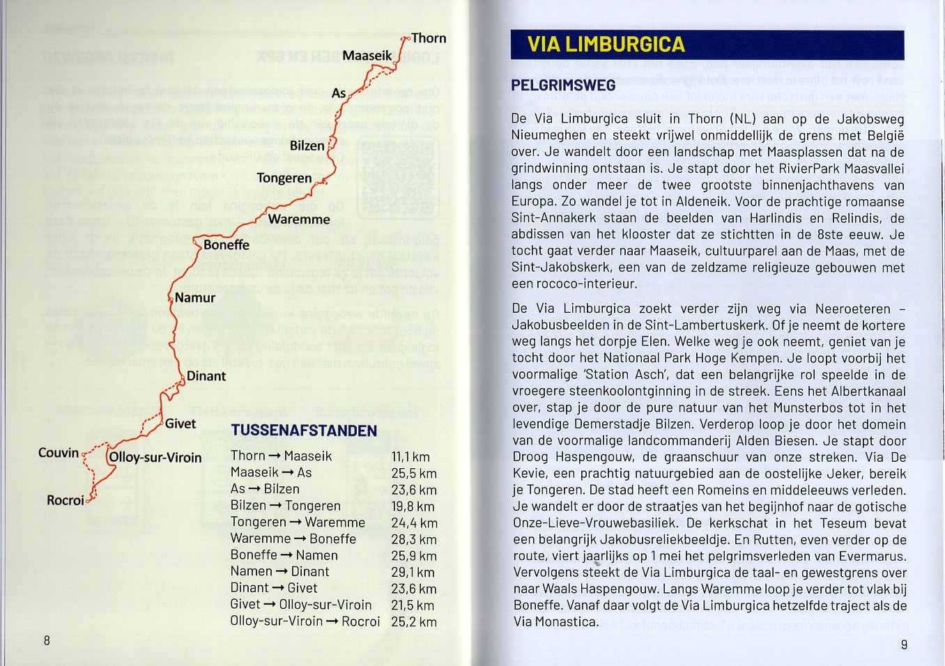 Tijdens deze pelgrimstocht doorkruis je Maaseik, Tongeren, Rutten, Namen, Leffe en Givet. De gids besteedt eveneens aandacht aan overnachtingsadressen, abdijen en kloosters, diensten voor toerisme. In Thorn, waar het Pelgrimspad vanuit Amsterdam en het Jacobspad vanuit Millingen door Limburg elkaar ontmoeten, begint deze route. De drie routes (Pelgrimspad, Jakobsweg en Via Limburgica) vallen samen tot Maaseik. Vandaar loopt de Via Limburgica door het Nationale Park Hoge Kempen richting Tongeren om uiteindelijk in Eghezée aan te sluiten op de Via Monastica naar Namen en Rocroi. De route naar Santiago gaat dan verder over de Via Campaniensis.