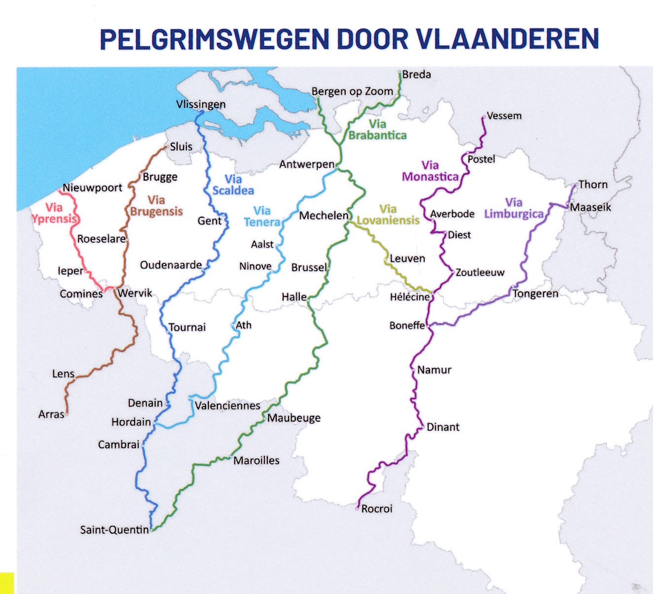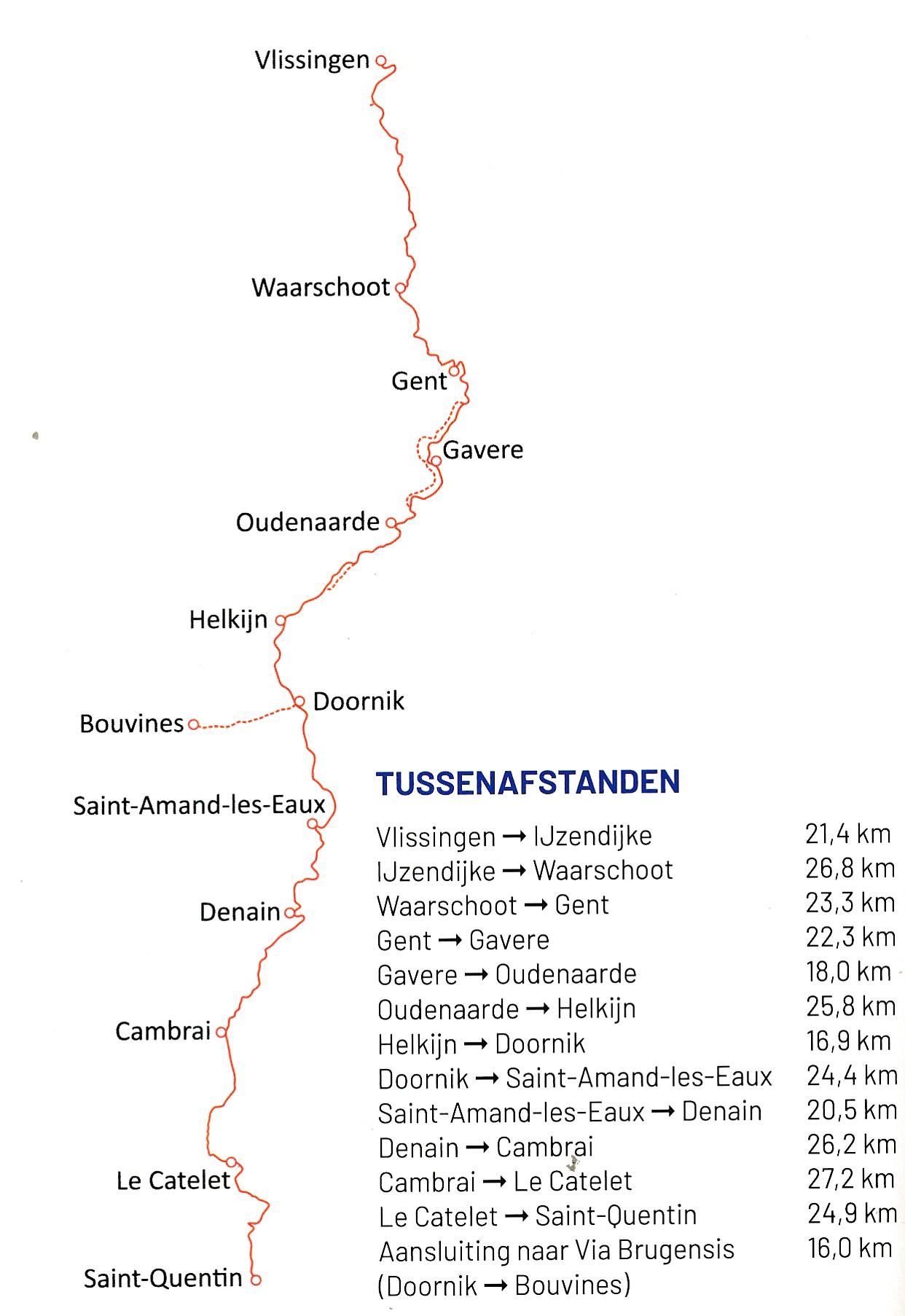 De Via Scaldea sluit in Vlissingen (NL) aan op de Jacobsweg Die Haghe. Door Zeeuws-Vlaanderen en het Meetjesland trek je naar Gent, met haar talrijke bezienswaardigheden twee bezoekdagen waard. Na de gezellige stadsdrukte struin je langs oude Scheldearmen, die zich omtoverden tot natuurgebieden. Na een korte zijsprong naar Ename steek je de Schelde over naar het mooie Oudenaarde. Dan komt Doornik in zicht, de op een na oudste stad van België. In Saint-Amand-les-Eaux kun je de verbazingwekkende abdijtoren bewonderen. Daarna stap je over de beroemde wielerkasseien van de Arenbergtrog. Verderop ligt de bisschopsstad Cambrai met haar rijke cultuurpatrimonium. Je pad loopt verder langs de cisterciënzerabdij van Notre-Dame de Vaucelles en eindigt aan basiliek van Saint- Quentin.