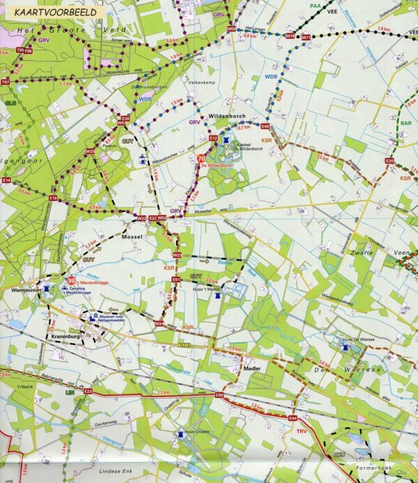 Gedetailleerde wandelkaart over het noordwestelijke kwart van de Achterhoek. Routes, knooppunten, horeca, campings en bezienswaardigheden ingetekend. Enigszins vereenvoudigde topografische weergave van landschappelijke details, waardoor het kaartbeeld wel heel helder is.