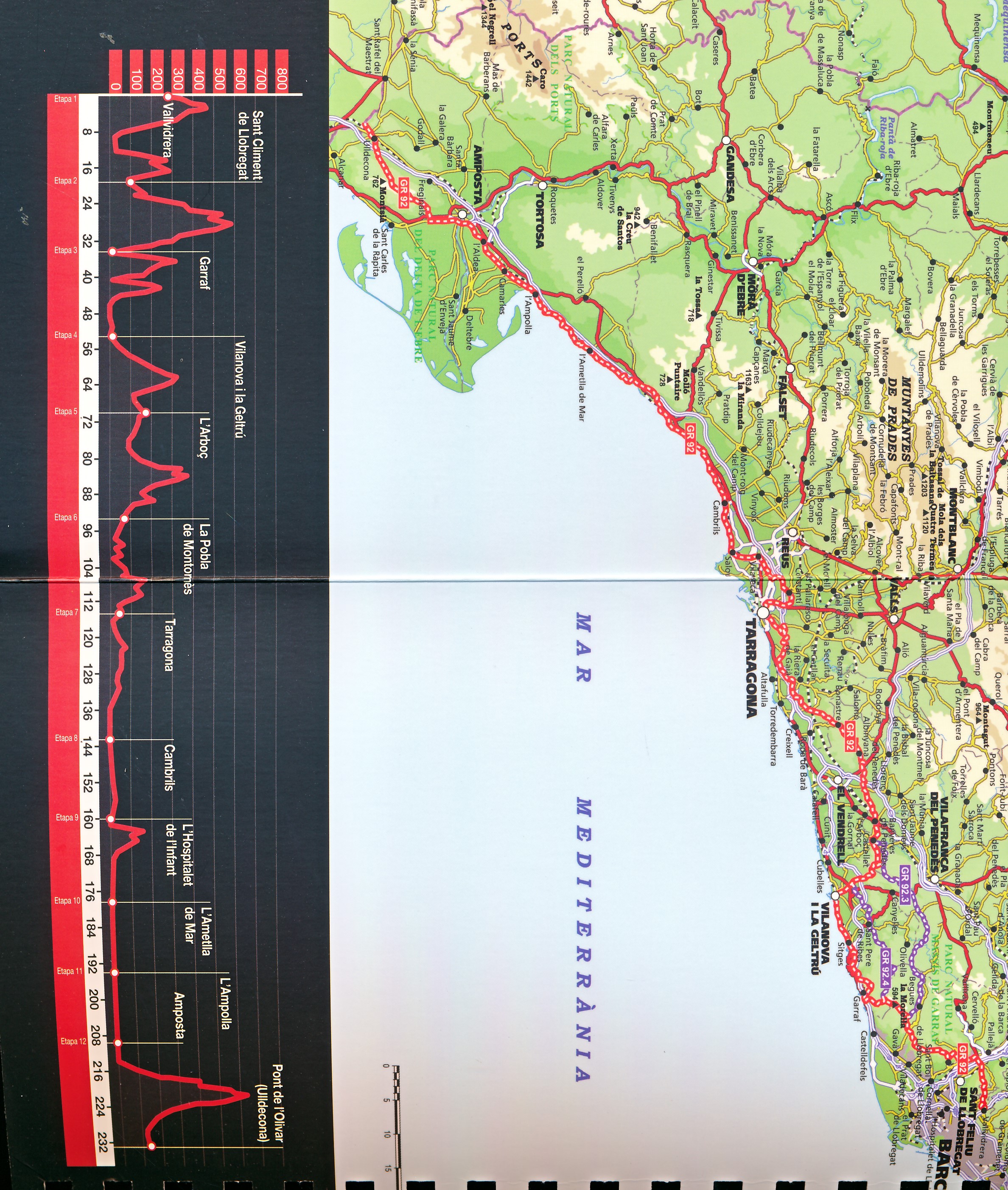 The GR 92 is a journey which borns in Port Bou and goes down trough the coastline of Catalonia to penetrate the territory of Valencia and down to Murcia and Andalusia. It is a long mileage to get into a guide, so the authors have adhered to the Principality of Catalonia. The GR 92 runs along the Catalan coast imitating the old way of all civilizations, both those who used a path to lower the Pyrenees to the Ebro as the Via Herculean, the Via Augusta, the French Way, the Valencia Way, N- 340 or the latest AP -7. The difference is that all these roads are designed for terrestrial communications and GR 92 is a journey on foot to enjoy playful coastal scenery in the country. For the GR 92 South Collserola, the vall del Llobregat, the Garraf Massif coast, the coastal mountain range, the camp de Tarragona, the Costa Daurada and the Delta de l'Ebre and the Serra de la Hoya Montsià of Ulldecona.