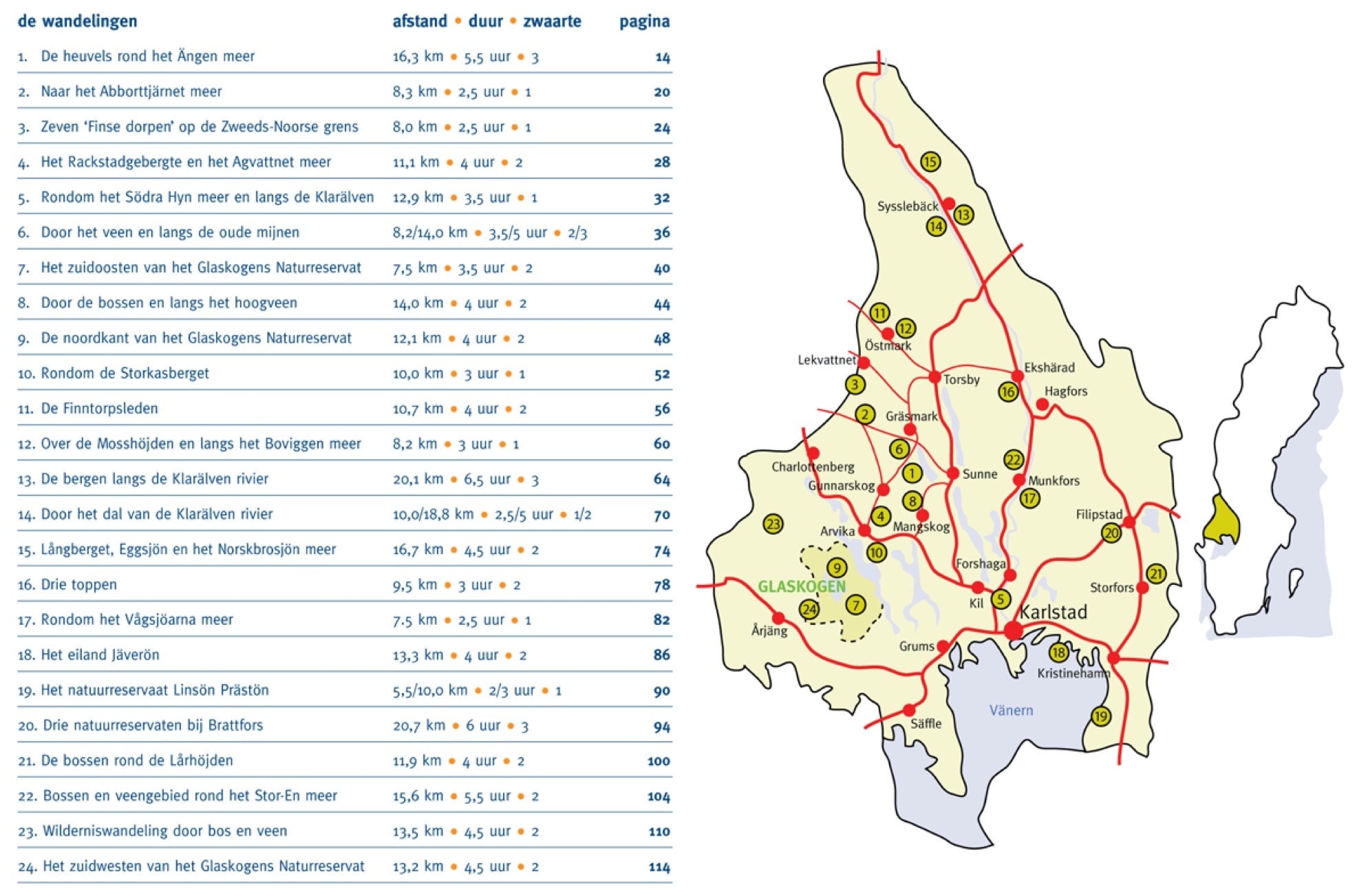Zo groen, zo uitgestrekt, zo leeg. Dat is het gevoel dat je steeds weer zult ervaren als je erop uit trekt in de Zweedse natuur. Zoveel land en zo weinig mensen, dat is iets wat we in Noordwest-Europa weinig kennen. De meeste Zweden wonen in de zuidelijke helft van het land, wat natuurlijk alles te maken heeft met de lengte van de winterdagen. Het is daar een stuk langer licht dan in het noorden. Hoe hoger je komt, hoe minder mensen er wonen. Värmland ligt ongeveer halverwege, net boven de lijn Oslo – Stockholm. Dun bevolkt genoeg om de natuur alle ruimte te kunnen geven. Het is een landelijke provincie, ook naar Zweedse begrippen.. Agrarisch ook, maar dan in een sector die voor ons wat minder vanzelfsprekend is: de bosbouw. Grote stukken land worden gebruikt voor de commerciële houtproductie. Al dat groen wordt afgewisseld met heel veel water. Värmland is het Zweedse merengebied bij uitstek. In ieder dal vind je een rivier, achter elke heuvel ligt een meer. Van heel erg groot tot lieflijk klein, overal in de provincie is water te vinden. Värmlanders leven buiten. Hun werk is veelal in de natuur en ze wonen in een landelijke omgeving. Bijvoorbeeld als bosbouwer, of als gastheer of –vrouw in de outdoor-sport. Van elandsafari’s tot raften, van alle mogelijke wintersporten tot kanovaren, het kan allemaal hier. Twaalf jaar na het verschijnen van de eerste druk van deze gids is er veel veranderd op wandelgebied in Värmland. Toen was er vrijwel niets beschreven, nu zijn er de Värmlandsleder: goed gemarkeerde routes die onderhouden worden, het merendeel rondwandelingen. In deze nieuwe editie van onze gids hebben we zeven van die routes opgenomen. Plus een aantal nieuwe routes, in gebieden die we nog niet kenden. Samen bieden ze een dwarsdoorsnede van al het goede dat Värmland te bieden heeft aan de wandelaar. In lengte variëren de wandelingen van 5,7 km tot 21 km, zodat er voor iedereen iets bij zit. Het zijn dus allemaal bestaande wandelingen, (soms summier) gemarkeerd. Ze zijn niet door ons uitgezet, maar wel door ons gelopen, beoordeeld, beschreven, in beeld en in kaart gebracht. Alles wat je hoeft te doen, is je wandelschoenen aantrekken en ontdekken wat Värmland zo bijzonder maakt.