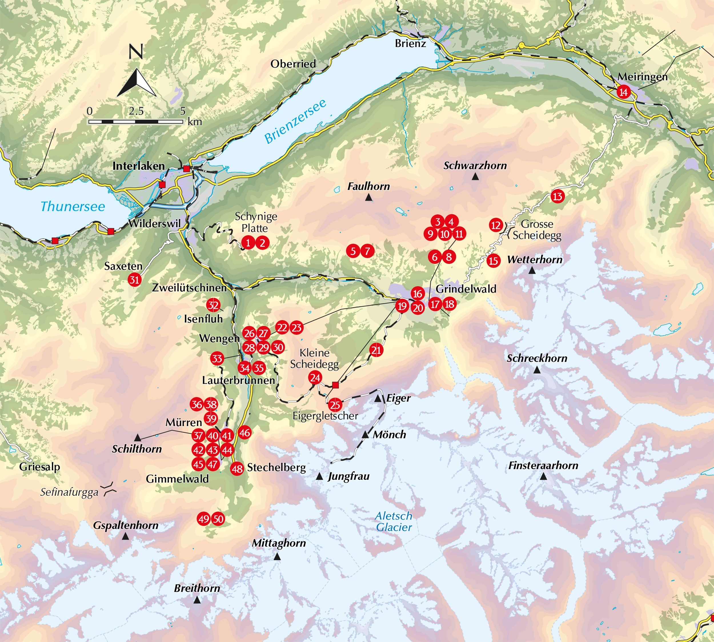 Jungfraujoch, Untersteinberg UNESCO World Heritage protected area, Schilthorn, Lauterbrunnen valley waterfalls, Wengen, Mürren, Männlichen, Grindelwald, Eiger, Mönch, Jungfrau, Isenfluh, Saxeten, Lobhorn, Alpiglen, Wetterhorn, Grosse Scheidegg, Kleine Scheidegg, Schynige Platte, Faulhorn, Bachsee, Schwarzhorn, Rotstock hut, Sefinafurgga, Allmendhubel, Stechelberg, Obersteinberg, Gimmelwald