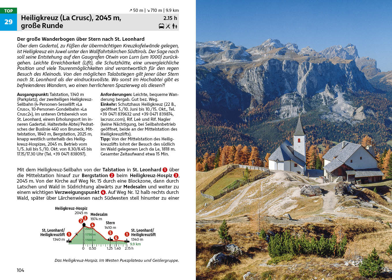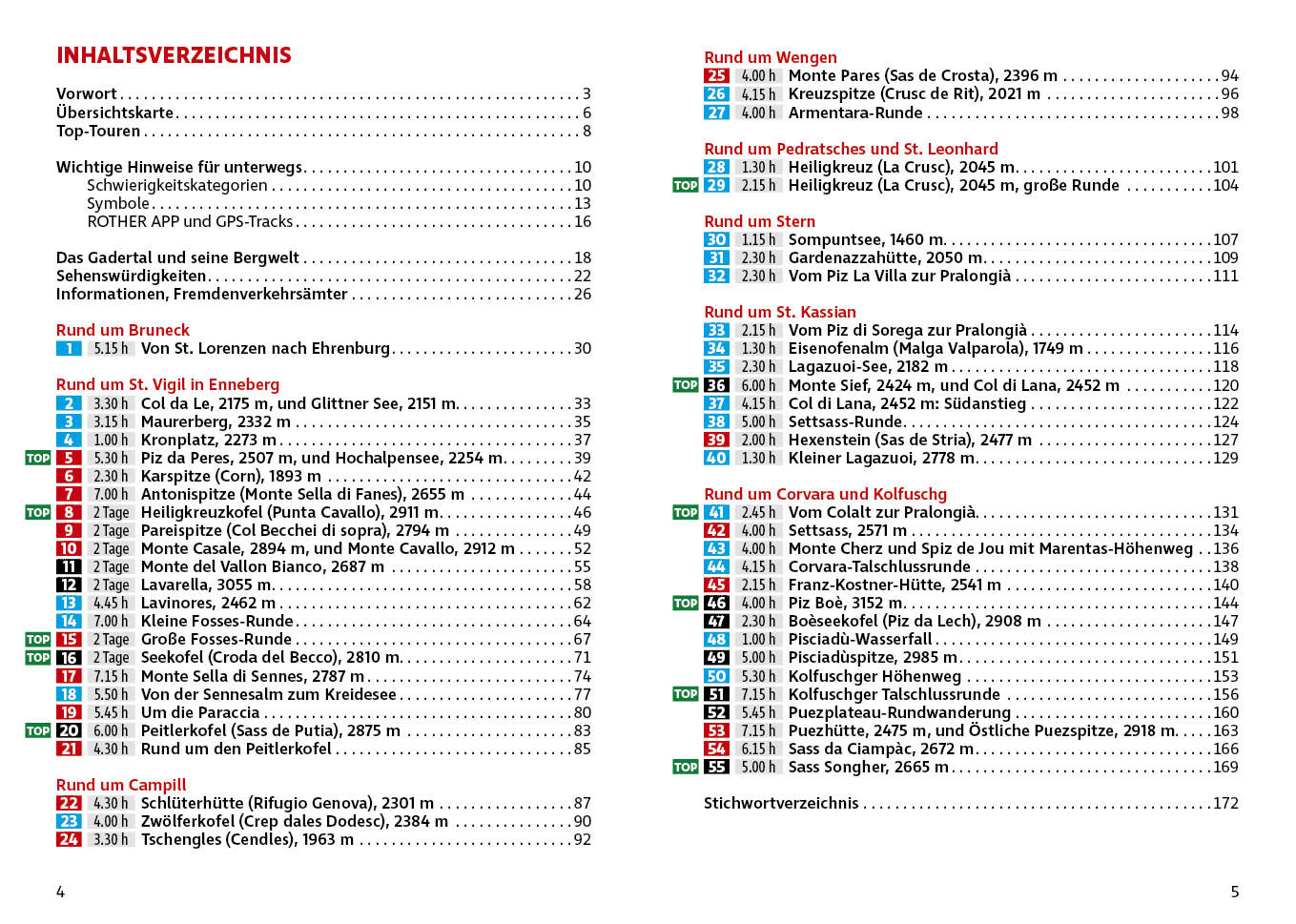 Fanes und Sennes sowie die großartigen Dolomitstöcke von Sella, Puez und Peitlerkofel umgeben das Gadertal. Einladende Erholungsorte, wie Pedratsches, St. Kassian, Corvara und Kolfuschg, sind beste Ausgangspunkte für Wandertouren. Der Heiligkreuzkofel bietet atemberaubende Tiefblicke ins Gadertal. Mit dem Piz Boé, dem höchsten Punkt der Sella, besteigt man einen Dreitausender mit herr-lichem Panorama. Entspannende Tage, fern von Trubel und Hektik, erlebt man im Campilltal und im schmucken Sonnendorf Wengen.