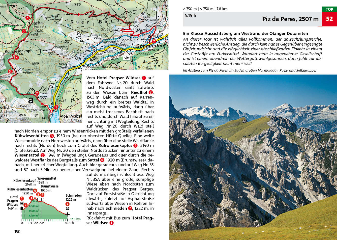 Die Auswahl umfasst Touren rund um den Pragser Wildsee, die Plätzwiese, den Furkelpass und den Kronplatz bei Bruneck. Beliebte Ausflugsziele finden sich auch rund um die Auronzohütte und den Paternsattel. Immer wieder bieten sich überwältigende Ausblicke auf die felsigen Zacken und Türme der Drei Zinnen, aufgrund ihrer Schönheit zum UNESCO Weltkulturerbe erklärt.