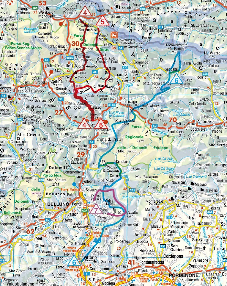 Alta Via = Höhenweg. Alta Via nr. 8: Bressanone - Salorno, 160km, 13 etappes; Alta Via nr. 9: Bolzano - Santo Stefano, 180km, 14 etappes; Alta Via nr. 10: Bolzano - Lago di Garda, 200km, 18 etappes. AV-8 en -9 zijn relatief eenvoudig, AV-10 weer iets pittiger. | Van alle tien routes zijn 1, 2, 8 en 9 relatief eenvoudig; routes 3 t/m 7 oplopend in moeilijkheidsgraad. Gedetailleerde routebeschrijvingen, overnachtingsinformatie (met berghutten) en eenvoudige kaartjes.