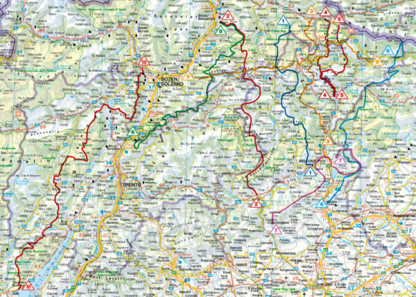 Alta Via = Höhenweg (hoogalpiene wandelroute). Alta Via nr. 8: Bressanone - Salorno, 160km, 13 etappes; Alta Via nr. 9: Bolzano - Santo Stefano, 180km, 14 etappes; Alta Via nr. 10: Bolzano - Lago di Garda, 200km, 18 etappes. AV-8 en -9 zijn relatief eenvoudig, AV-10 weer iets pittiger. | Van alle tien routes zijn 1, 2, 8 en 9 relatief eenvoudig; routes 3 t/m 7 oplopend in moeilijkheidsgraad. Gedetailleerde routebeschrijvingen, overnachtingsinformatie (met berghutten) en eenvoudige kaartjes.