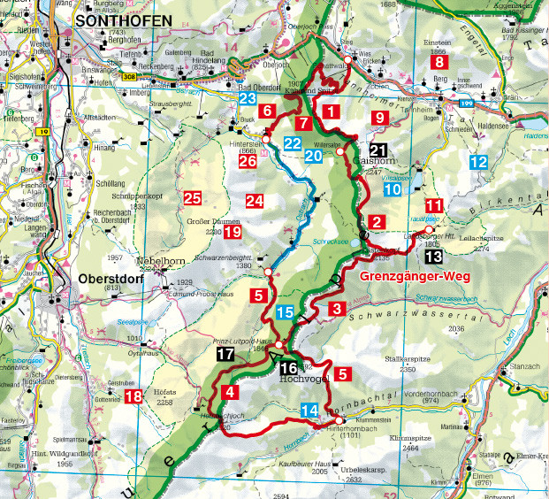 In de Allgäuer Hoge Alpen, rond de Hochvogel, nodigt de Grenzgängerweg u uit voor een spannende zesdaagse trektocht. De route van 85 kilometer loopt bijna uitsluitend over alpiene en hoogalpiene beklimmingen en paden op 1700 tot 2200 meter hoogte: sprankelende bergmeren, rotsachtige toppen, bloemrijke weiden, goed gemarkeerde paden en liefdevol gerunde hutten, weg van de grote langeafstandswandelpaden. Overnachtingen zijn er in de Willersalpe, de Landsberger Hütte, het Prinz-Luitpold-Haus en in Hinterhornbach hoog boven het Lechtal en in Hinterstein.