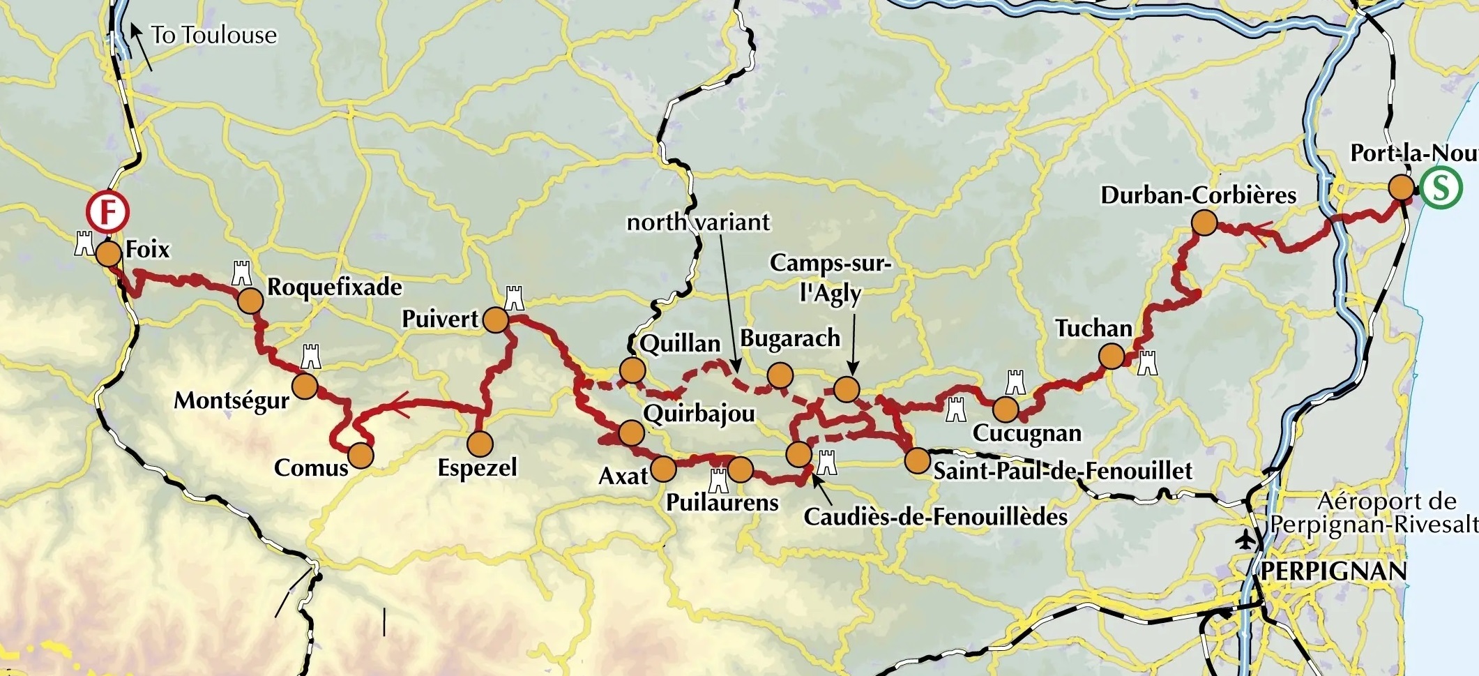Port-la-Nouvelle, Durban-Corbières, Tuchan, Cucugnan, Saint-Paul-de-Fenouillet, Caudiès-de-Fenouillèdes, Puilaurens, Axat, Bugarach (north variant), Quillan (north variant), Puivert, Espezel, Montségur, Montferrier, Foix