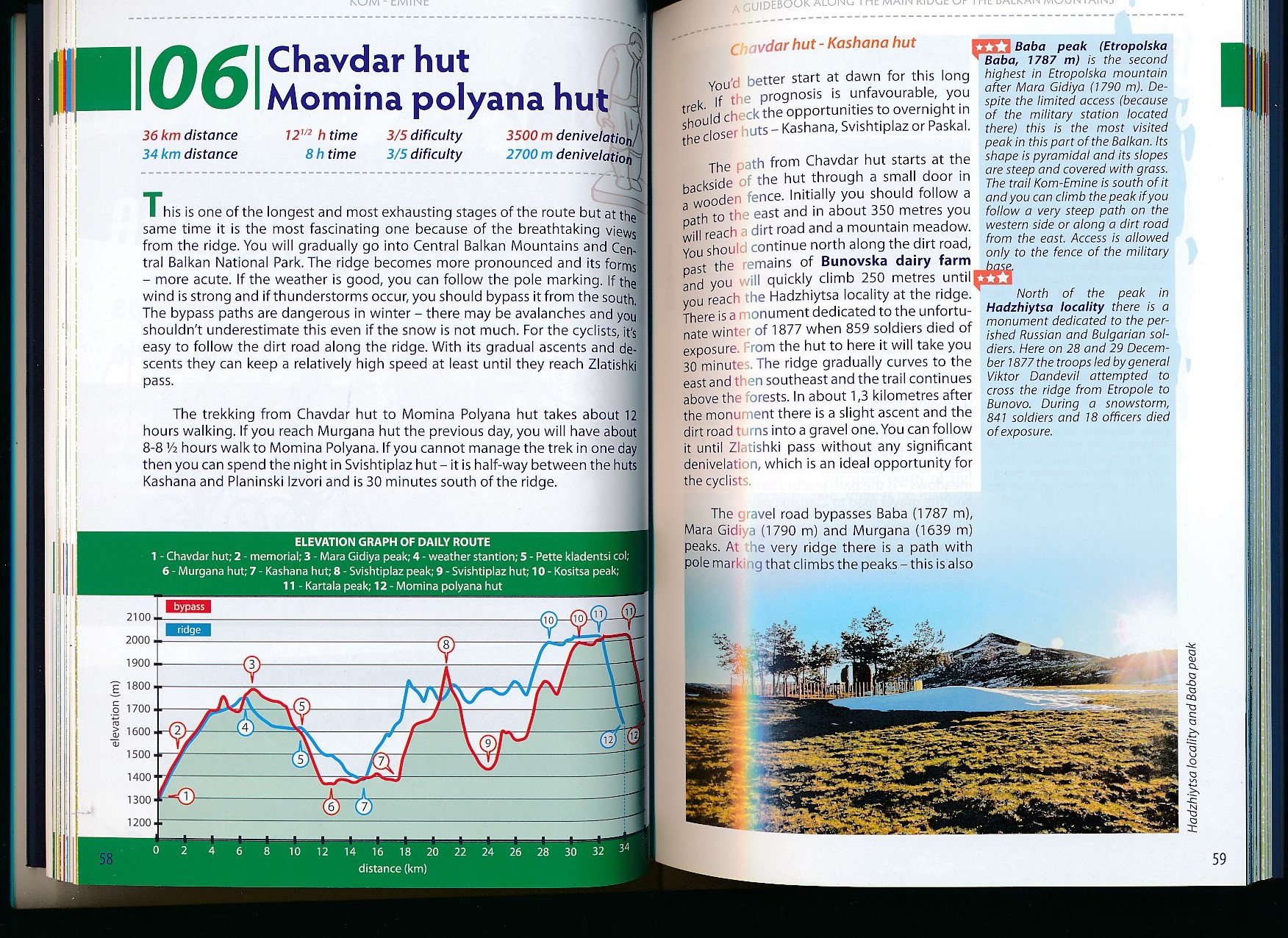 650 km across the majestic Balkan on foot, by bike or skiing.Kom-Emine is the most popular and difficult tourist trek in Bulgaria and a part of the International European Route E3. It follows the main ridge of the Balkan Mountains across Bulgaria from west to east. The guidebook is divided into 20 stages each of them including:– Detailed description;– Route map;– Sightseeing along the trail;– Elevation chart;– Information about huts and sleeping accommodations;– 160 full-color pages;– Authors photographs;– Interesting and useful applications.The guidebook fits well in most backpacks side pockets. The soft double cover ensures a higher durability of the book.
