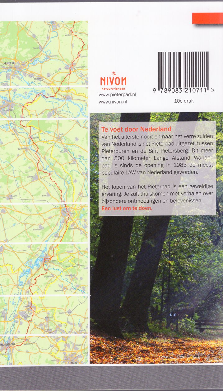 Na Vorden gaat de tocht verder in de Liemers, een houtrijk landschap met verspreide boerderijen, bolle enken en beken. Verrassend is de overgang van de heuvels in Montferland naar het dal van de Rijn, om weer omhoog te gaan naar het Rijk van Nijmegen. Dan treedt het Pieterpad in de voetsporen van de bedevaartgangers in Limburg en voert langs de Maas, en de grens van Nederland naar het heuvellandschap van Zuid Limburg. Via Maastricht eindigt de route op de Pietersberg. Daar is een aansluiting op de GR 5 of de Via Mosana. ** Alle wandelgidsen van Wandelplatform en NIVON bevatten gedetailleerde top. kaarten, de routebeschrijving (in 2 richtingen!), leuke achtergrondinfo en praktische zaken omtrent overnachting en openbaar vervoer.