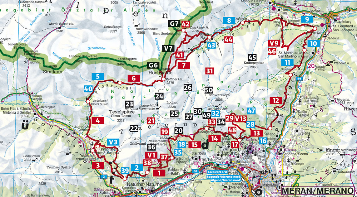 Meran, de parel van Zuid-Tirol, wordt in het noorden gedomineerd door een grandioos gebergte - de Texelgruppe - waarvan de toppen tot 3.000 meter boven de stad uittorenen. Een enorm hoogteverschil! De Meraner Höhenweg loopt langs de flanken van deze bergen. Het heeft zich ontwikkeld tot een van de meest populaire meerdaagse rondwandelingen in de Alpen - en terecht! De andere wandelgids "Meraner Höhenweg" is de perfecte planningsbasis voor de klassieke vijf tot zesdaagse route - met alle belangrijke informatie, variaties en omwegen naar de top. Op de Meraner Höhenweg beweegt u zich hoog boven het Passeierdal, boven het Adigedal met het Meraner bekken en boven het Schnalsdal. Steeds weer kom je schilderachtig gelegen bergboerderijen en alpenweiden tegen, waarvan sommige ook als accommodatie worden gebruikt. De etappes aan de noordkant leiden door de hoge bergdalen onder de hoofdkam van de Ötztaler Alpen: het Pfossental en het Pfelderer Tal. Daartussen vormt de bijna 2.900 meter hoge Eisjöchl het hoogste punt van de Meraner Höhenweg. Vlak ernaast biedt de Stettiner Hut accommodatie in het niets. Verschillende varianten leiden langs de Spronser-meren, die tot de charmantste natuurschoonheden van Zuid-Tirol behoren. Kinderen vinden er ook grote "avontuurlijke speeltuinen". De nakomelingen voelen zich meestal thuis bij de kinderen en de dieren van de bergboerderijen.