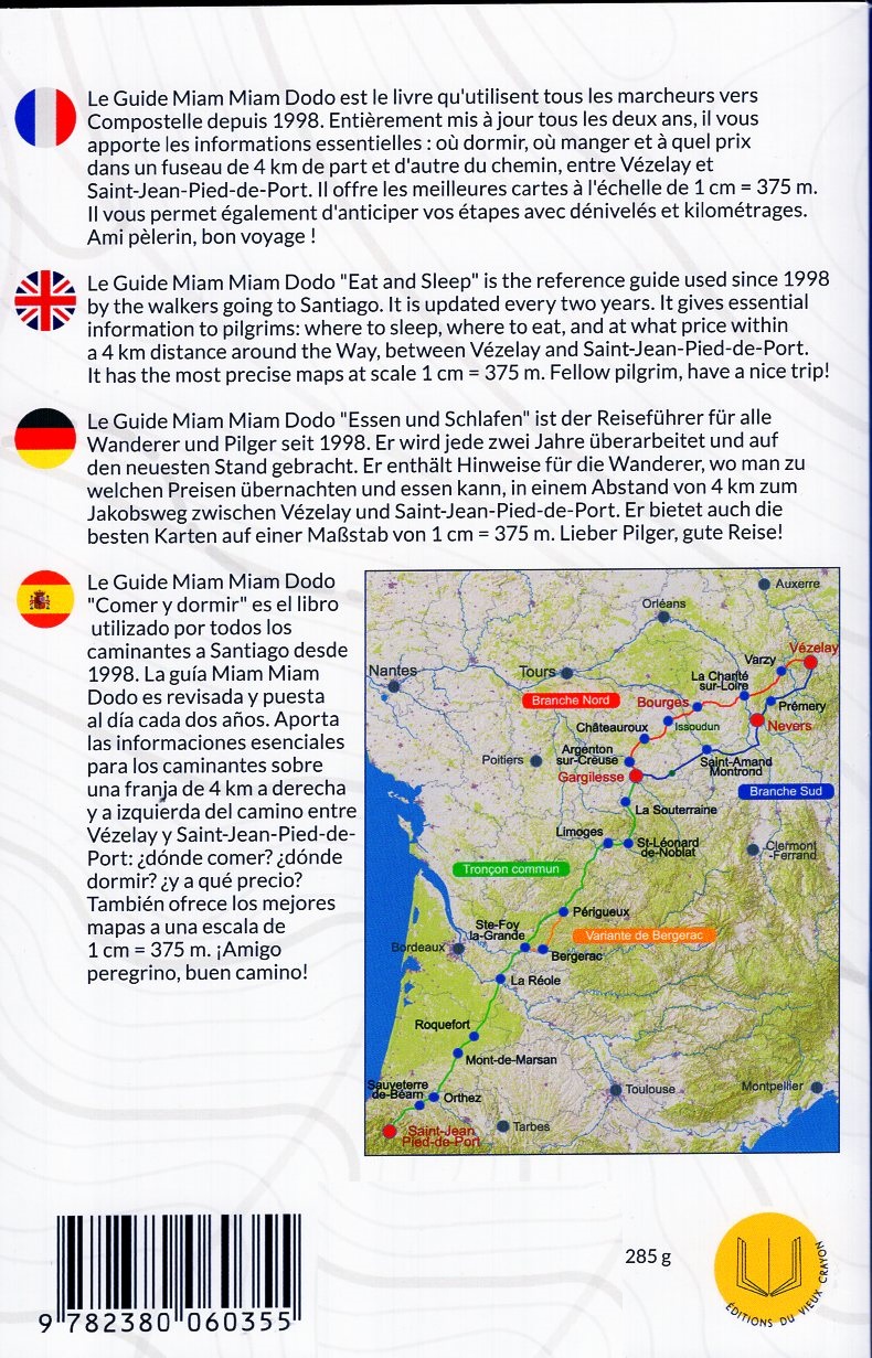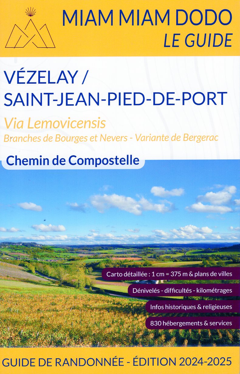 Deze gids beschrijft de volledige route van Vézelay naar Saint-Jean-Pied-de-Port aan de Spaanse grens. Het boek bevat goede gedetailleerde kaarten waarop de route op een heldere wijze is ingetekend. Daarnaast is dit de gids met verreweg de meeste informatie m.b.t. overnachtingsmogelijkheden onderweg (inclusief emailadressen, telefoonnummers en openingstijden). Van luxe tot basaal, en alles daar tussenin. Plus plaatsen waar men kan eten en drinken, waar supermarkten zijn en eerste hulpposten. De boekjes zijn Franstalig maar veel informatie is aan de hand van symbolen. Daarnaast hebben wij deze boekjes voorzien van de door ons samengestelde uitgebreide Frans-Nederlandse wandelwoordenlijst (ca. 500 woorden).