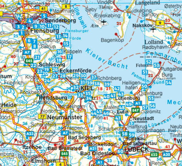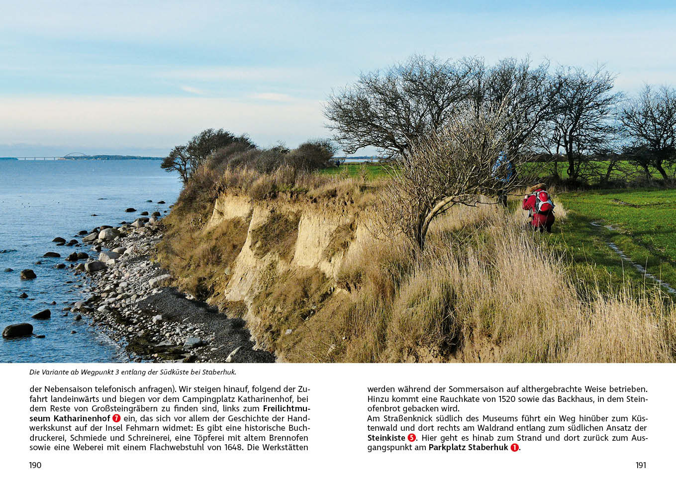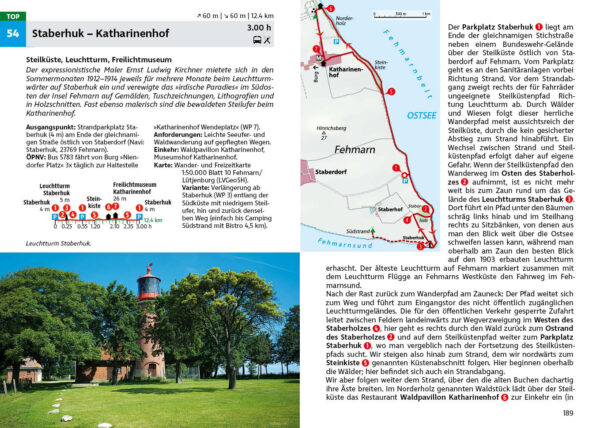 Handzaam gidsje, dat zó in je broekzak past, met (meestal zo'n vijftig) wandelingen, die in lengte variëren van een paar uur tot maximaal een dag. Met een duidelijke onderverdeling in een paar moeilijkheidscategorieën (eenvoudig tot pittig). De eenvoudige (blauwe) wandelingen zijn ook goed met kinderen te doen. De wandelingen zijn ingetekend op - vrij simpele - kaartjes. De routebeschrijvingen zijn prima en er wordt aangegeven waar je onderweg iets kunt eten, drinken en, waar dat van pas komt, overnachten. Duitstalig. | Von der Flensburger Förde bis zur Vogelinsel Fehmarn und zur Lübecker Bucht erschließt dieser Wanderführer Schleswig-Holsteins wunderschöne Ostseeküste. Wie in einem Bilderbuch präsentieren sich Förden und Steilküsten-Trails, aussichtsreiche Moränen, edle Schlösser und reetgedeckte Häuser. An die Kieler Förde schließen die Seebäder der Probstei und Wagriens an. Im Nordosten liegt Fehmarn mit Traumstränden und alten Buchen über Steilküsten.Im Rauschen der Ostseeküste lassen sich auch im Binnenland schhöne Wanderungen unternehmen: Der Naturpark Holsteinische Schweiz lockt mit einer malerischen Seen- und Kuppenlandschaft. Der Aufstieg zum Aschberg mit Blick über Seen hinweg bis zur Eckernförder Bucht zählt ebenso zu den Top-Touren wie der Hessenstein mit einem weitläufigen Panorama bis nach Dänemark.
