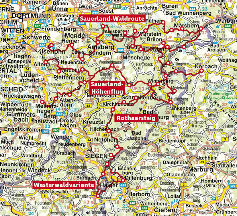 Der Rothaarsteig, als Qualitätsweg »Wanderbares Deutschland« und als einer der »Top Trails of Germany« ausgezeichnet, ist ein Highlight für Natur- und Wanderliebhaber. Der »Weg der Sinne«, wie er auch genannt wird, durchquert gemeinsam mit dem Sauerland-Höhenflug und der prämierten Sauerland-Waldroute das »Land der 1000 Berge«. Zusammen mit den zahlreichen Zu- und Rundwegen ergibt sich ein weitläufiges Wegenetz von mehr als 1000 Kilometern - ein wahres Paradies für Wanderer.