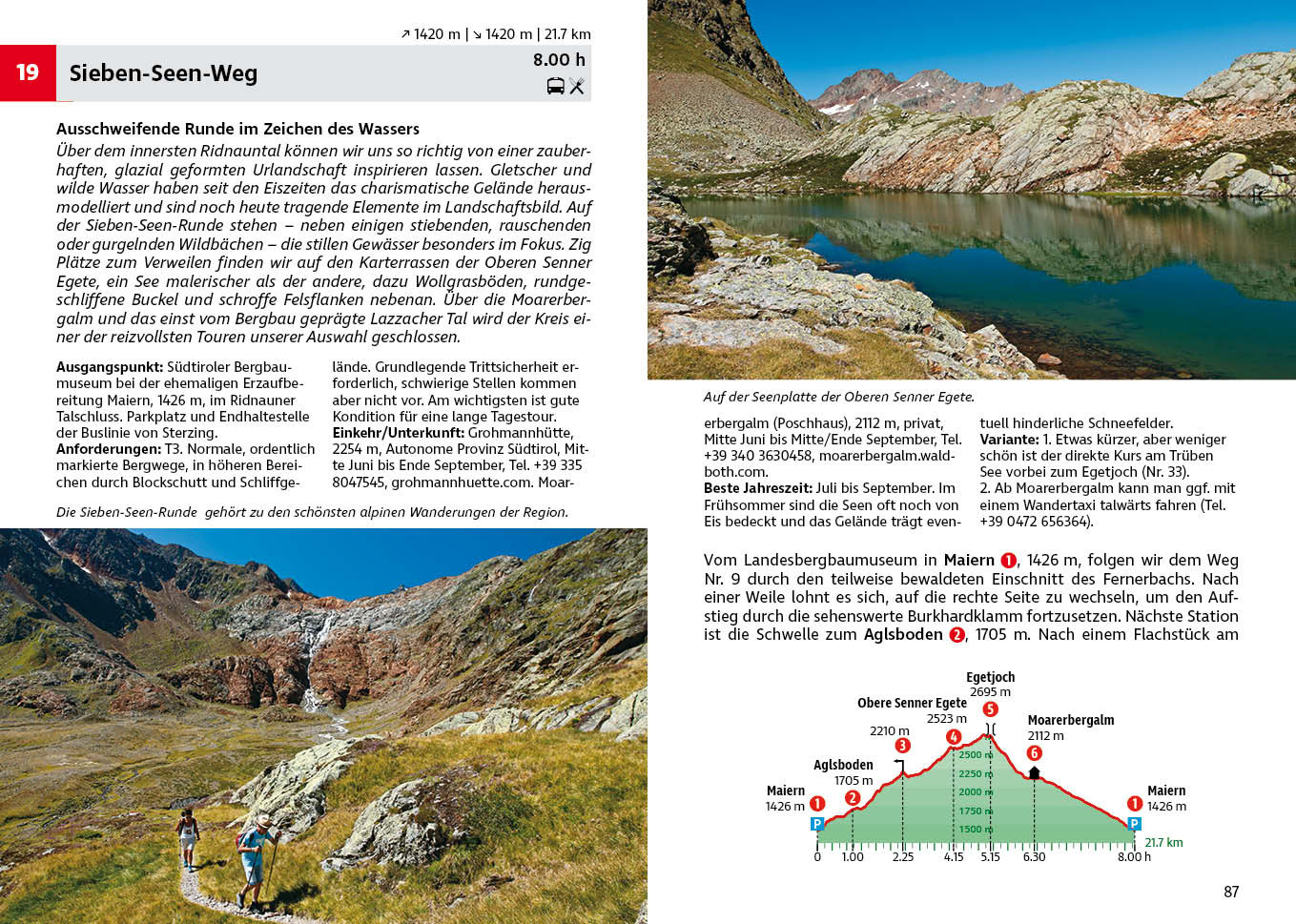 Handzaam gidsje, dat zó in je broekzak past, met (meestal zo'n vijftig) wandelingen, die in lengte variëren van een paar uur tot maximaal een dag. Met een duidelijke onderverdeling in een paar moeilijkheidscategorieën (eenvoudig tot pittig). De eenvoudige (blauwe) wandelingen zijn ook goed met kinderen te doen. De wandelingen zijn ingetekend op - vrij simpele - kaartjes. De routebeschrijvingen zijn prima en er wordt aangegeven waar je onderweg iets kunt eten, drinken en, waar dat van pas komt, overnachten. Duitstalig. | Bergsteigerische Hochgefühle im alpinen Ambiente, kulinarischer Genuss auf sonnig-gemütlichen Hütten und Almen und malerische Idylle auf talnahen Wegen – Spannung und Abwechslung sind südlich des Brenners garantiert! 56 vielfältige Touren stellt der Rother Wanderführer »Rund um Sterzing« dazu vor: hochalpine Gipfelbesteigungen bis in Höhen von 3500 Metern, genussvolle Alm- und Hüttenwanderungen und einfache Talwanderungen. Weiträumig, überraschend vielseitig und kaum überlaufen präsentiert sich das Tourengebiet, das neben dem Wipptal die Seitentäler von Pflersch, Ridnaun, Ratschings und Pfitsch umfasst.