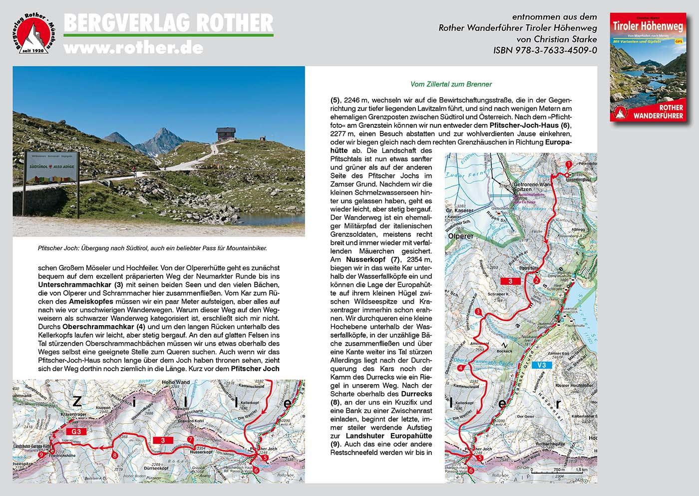 De Tiroler Höhenweg voert je door berggebieden met zeer uiteenlopende kenmerken: hij voert door de Zillertaler Alpen met hun indrukwekkende gletsjers, over de Brennerpas en vervolgens door de Tribulaune met zijn heldere dolomieten toppen. De route loopt vervolgens door de Stubaier Alpen en het Ötztal en doorkruist de Zuid-Tiroolse Texelgruppe met de fabelachtige Spronser meren. Na 130 kilometer bereik je eindelijk Merano. Als grensoverschrijdende langeafstandswandelroute verbindt de Tiroler Höhenweg incidenteel wat ooit door de Eerste Wereldoorlog gescheiden was. De etappes worden gepresenteerd met nauwkeurige beschrijvingen van het parcours, kaartgedeelten waarop de route is aangegeven en informatieve hoogteprofielen. Informatie over vervoermiddelen en winkelmogelijkheden vereenvoudigen de etappeplanning. GPS tracks zijn beschikbaar om te downloaden. Bovendien biedt de wandelgids gedetailleerde informatie over geschiedenis, cultuur en bezienswaardigheden, alsmede vele tips over waardevolle plaatsen om te stoppen voor een verfrissing.