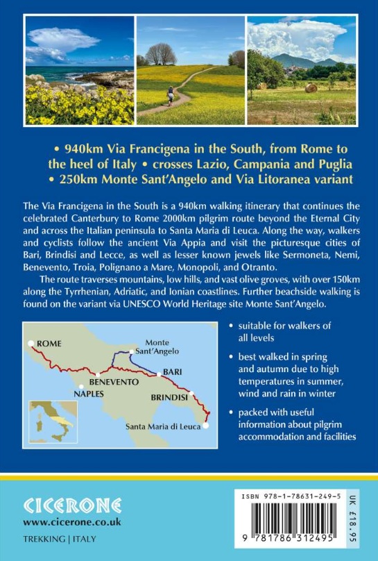 The route passes through Lazio and into Campania before traversing Puglia, where it concludes at Santa Maria di Leuca. Described in 52 stages, including alternative routes, with information on facilities and pilgrim hostels.