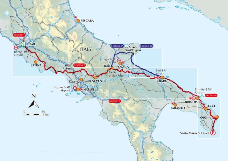 Rome, Benevento, Bari, Brindisi, Lecce, Otranto and Santa Maria di Leuca. Variant route destinations include San Giovanni Rotondo, Monte Sant'Angelo and Barletta.