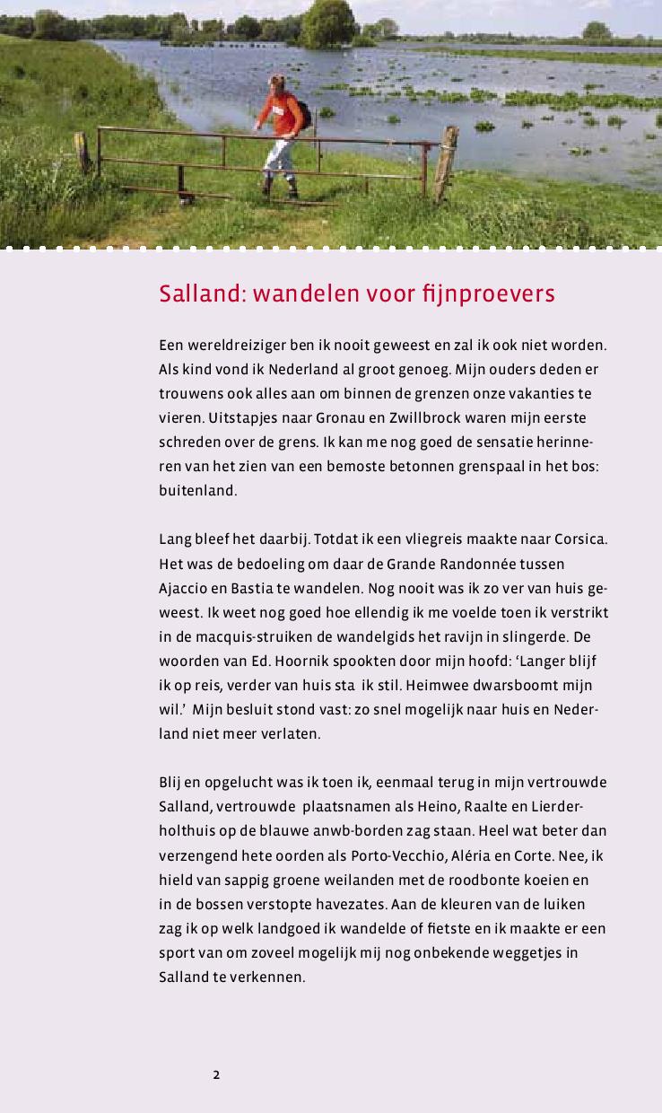 Struinen door uiterwaarden, dijken, moerassen, bossen, landgoederen, heidevelden, heuvels of bergen: in Salland kan het allemaal. Het landelijke gebied tussen Vecht, IJssel, Regge en Schipbeek kenmerkt zich door een grote verscheidenheid aan natuur en landschap. Een uitgelezen terrein voor wandelaars.'Wandelen in het hart van Salland' bevat 16 rondwandelingen. Ze variëren van acht tot vijfentwintig kilometer en zijn daardoor niet alleen geschikt voor de doorgewinterde wandelaar maar zeker ook voor mensen die niet zoveel kilometers in de benen hebben.Bij de samenstelling van de routes is uitgegaan van het 'Wandelnetwerk Salland': een uitgebreid netwerk van wandelpaden die met gekleurde pijlen zijn aangegeven. De routes in deze gids combineren veel van deze 'ommetjes' tot dagtochten waarbij je onderweg niet alleen verzekerd bent van prachtige wandelingen maar ook van adressen om te eten, drinken of zelfs te overnachten.