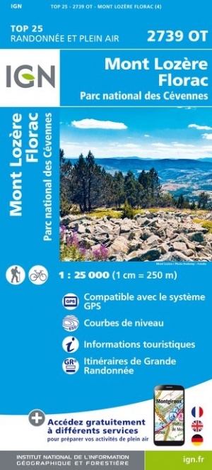 Dit is een deel uit de T-serie van de IGN 25 kaarten. Deze kaarten hebben een kaartnummer dat eindigt op T, dat staat voor 'touristique'. Dat betekent dat de kaarten veel toeristische informatie geven, zoals wandelroutes. Zowel grandes randonnées (langeafstandswandelpaden) als petites randonnées staan erop. En daarnaast symbolen voor campings, gîtes d'étape, bezienswaardigheden, enzovoorts. Verder zijn deze topografische kaarten uitermate gedetailleerd, met nauwkeurige registratie van heel veel landschapselementen, waaronder alle mogelijkeverkeerswegen, bebouwing, landgebruik, bos, open gebied, beekjes en overige binnenwateren, perceelsgrenzen, boomsingels, enzovoorts. Ieder boerenstalletje staat erop! Reliëf wordt aangegeven met hoogtelijnen en schaduwering.