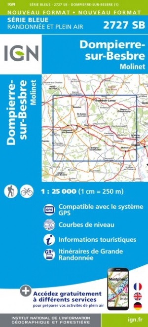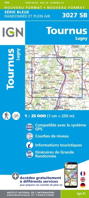 Dit is een deel uit de T-serie van de IGN 25 kaarten. Deze kaarten hebben een kaartnummer dat eindigt op T, dat staat voor 'touristique'. Dat betekent dat de kaarten veel toeristische informatie geven, zoals wandelroutes. Zowel grandes randonnées (langeafstandswandelpaden) als petites randonnées staan erop. En daarnaast symbolen voor campings, gîtes d'étape, bezienswaardigheden, enzovoorts. Verder zijn deze topografische kaarten uitermate gedetailleerd, met nauwkeurige registratie van heel veel landschapselementen, waaronder alle mogelijkeverkeerswegen, bebouwing, landgebruik, bos, open gebied, beekjes en overige binnenwateren, perceelsgrenzen, boomsingels, enzovoorts. Ieder boerenstalletje staat erop! Reliëf wordt aangegeven met hoogtelijnen en schaduwering.