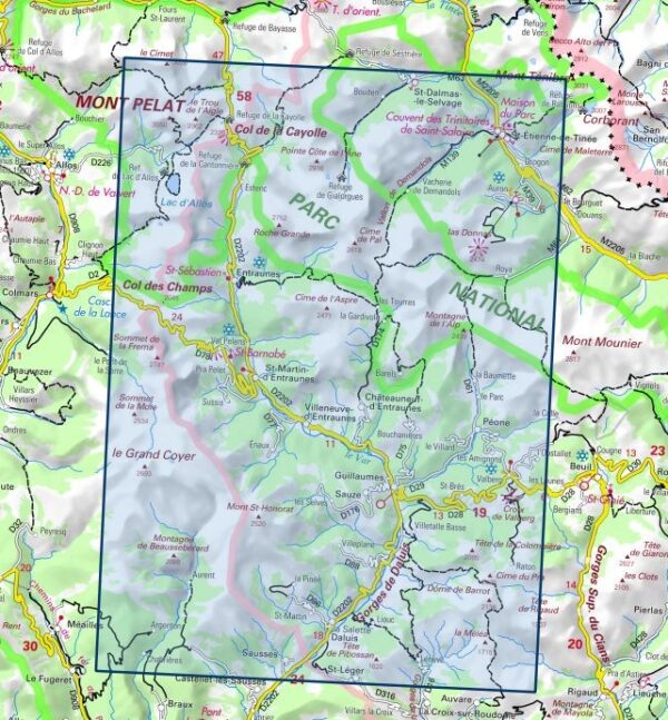 Dit is een deel uit de T-serie van de IGN 25 kaarten. Deze kaarten hebben een kaartnummer dat eindigt op T, dat staat voor 'touristique'. Dat betekent dat de kaarten veel toeristische informatie geven, zoals wandelroutes. Zowel grandes randonnées (langeafstandswandelpaden) als petites randonnées staan erop. En daarnaast symbolen voor campings, gîtes d'étape, bezienswaardigheden, enzovoorts.