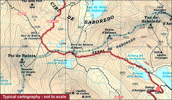 Gedetailleerde kaart van een meerdaagse rondwandeling in een deel van de Pyreneeen. Symbolen voor campings, berghutten en logies en toeristische info. Kaart maakt deel uit van ons assortiment Wandelkaarten Spaanse Pyreneeën.