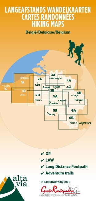De Belgische reisboekhandel Alta Via brengt 6 wandelkaarten uit. Deze kaarten zijn aan beide kanten bedrukt en bedekken het volledige Belgische grondgebied. Je vindt er alle Belgische GR-paden, de aansluitende Nederlandse LAW's, enkele pelgrimsroutes en andere gemarkeerde langeafstandswandelingen zoals de Escapardenne Eisleck Trail of de Transardennaise.