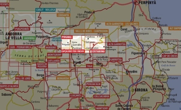 Set van twee wandelkaarten. Routes ingetekend. Symbolen voor campings, berghutten en logies en toeristische info. | De recente oprichting van het Parc Natural de les Capçaleres del Ter en del Freser opent nieuwe perspectieven voor de toekomst in een berggebied dat traditioneel wordt bezocht en bezocht door wandelaars en bergbeklimmers. Het beschermen van uw natuurlijke, landschappelijke waarden zal zeker helpen om dit gebied te behouden. De set bestaat uit twee kaarten; een van de westelijke delen van het park, met de top van Puigmal, de Ribes-vallei en het 'heiligdom' Núria; en de andere op het oostelijke deel, met de Camprodon-vallei, de Costabona-top en het Ulldeter-circus.