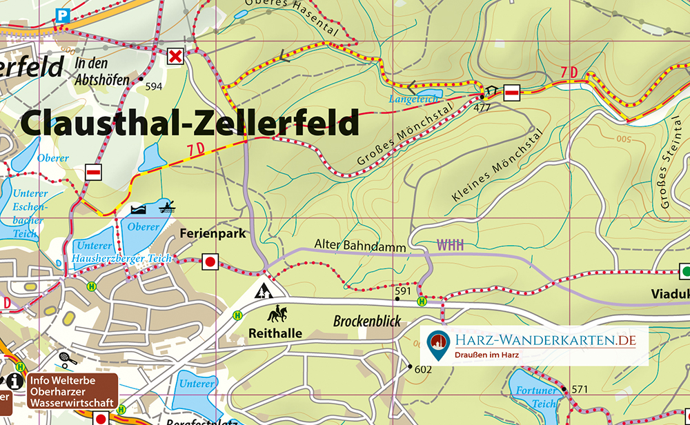 Er lopen verschillende bewegwijzerde langeafstandswandelpaden door de Oberharz. De Harzer Försterstieg, die Goslar met Kamschlacken verbindt, is op de kaart aangegeven. U vindt er ook het westelijke deel van de Harzer Hexen-Stieg en de noordelijke delen van de Harzer Baudensteig.