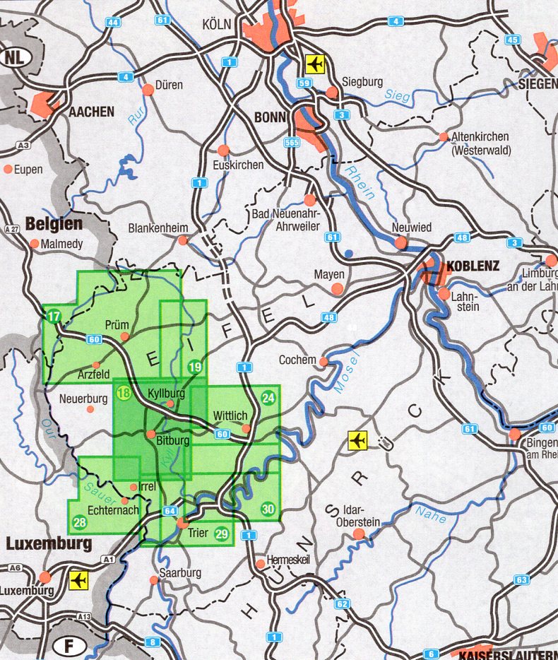 Kaarten en gidsen > Wandelen > Wandelkaarten > Europa > Duitsland > West-Duitsland > Rheinland-Pfalz (met Eifel) > Eifel > wandelkaart EV-18 Bitburger Land 1:25.000