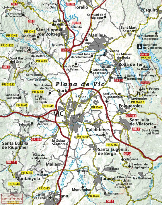 Gebied van de kaart: Vlakte van Vic. Oostelijke uiteinde van de Centraal-Catalaanse depressie. Provincie Osona. Kenmerken: topografische kaart op een schaal van 1:25.000 met informatie die van belang is voor wandelaars en natuurliefhebbers: bewegwijzerde paden (GR's, PR's en SL), paden, paden, natuurlijke en culturele landschapselementen, grotten...