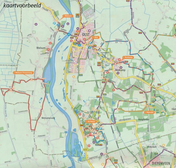 Mooie, gedetailleerde (topografische) wandelkaart van het Salland, met plaatsen zoals Deventer, Raalte, Wijhe en de Holterberg. In dit gebied is een wandelnetwerk aangelegd, zodat het je als wandelaar heel gemakkelijk wordt gemaakt. De kaart toont alle wandelknooppunten van dit netwerk. Straatnamen en horecagelegenheden staan er ook op. Met 875 kilometer aan gemarkeerde wandelpaden (140 gemarkeerde wandelroutes). Ook toont de kaart de 67 startpunten met informatiepanelen die u de wegwijzen.
