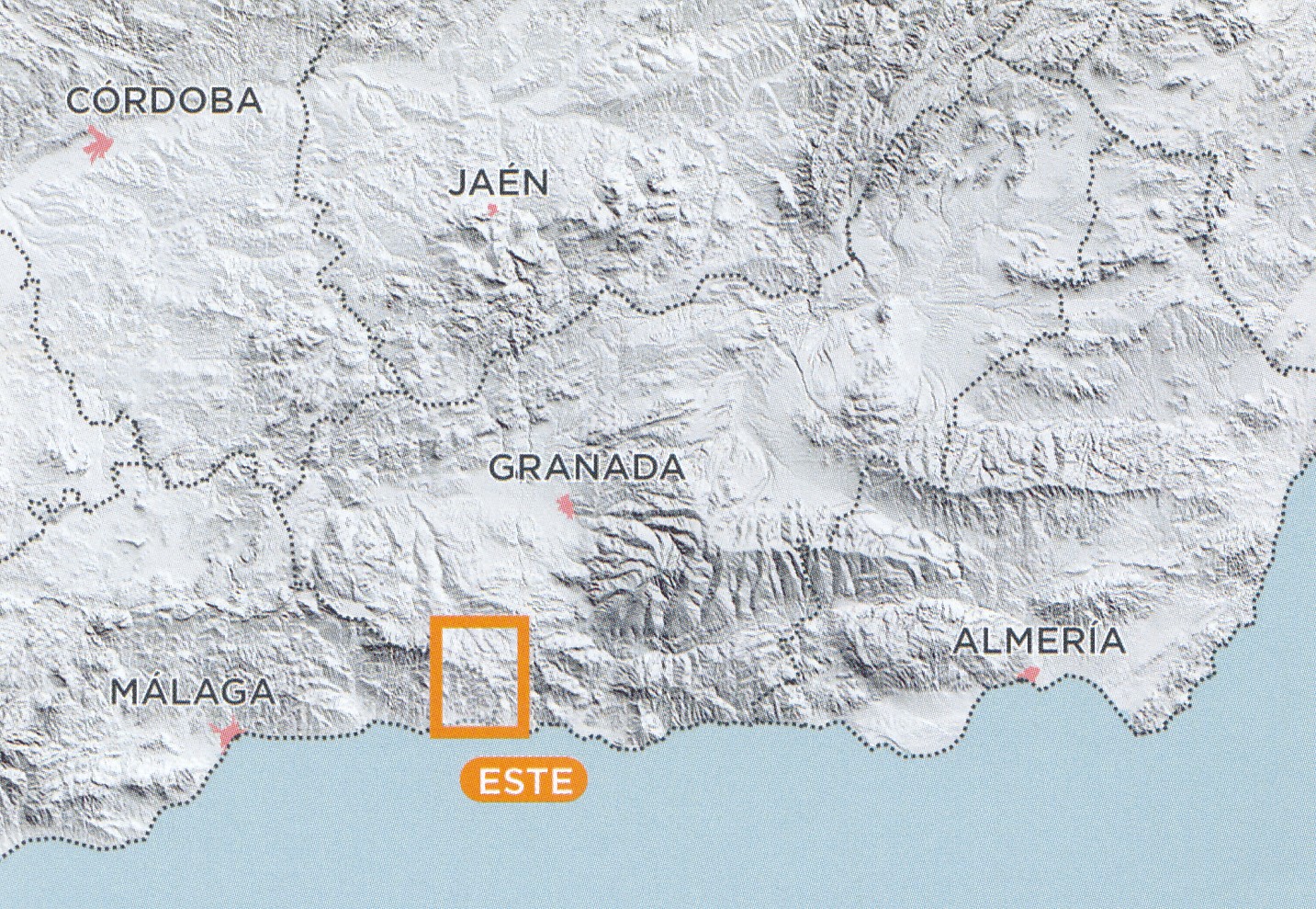 Topografische kaart van het Natuurpark Sierras de Tejeda, Almijara en Alhama'. Hier vind je meer dan 40.000 hectare beschermd gebied met een indrukwekkende natuurlijke rijkdom. De toppen, sommige meer dan 2.000 m hoog, vormen een natuurlijke grens tussen de provincies Granada en Malaga.