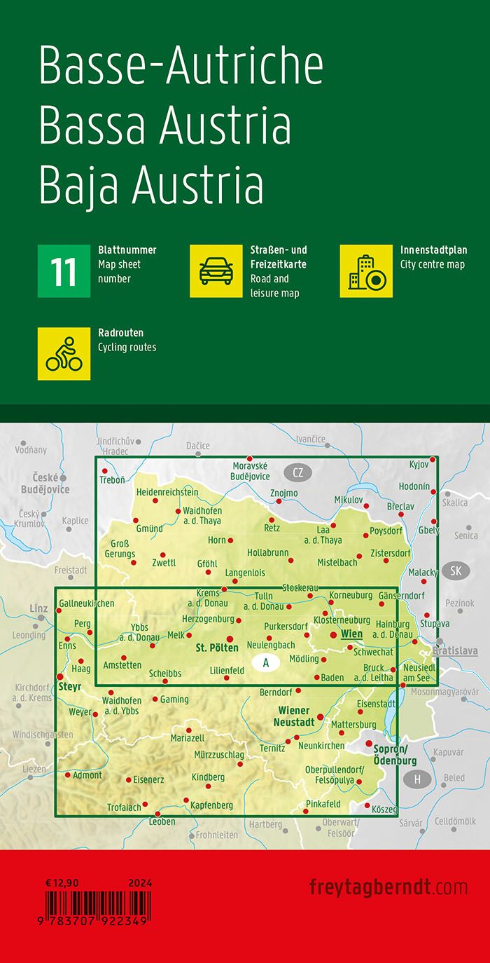 Deze wegen- en recreatiekaart van Niederösterreich op een schaal van 1:150.000 bevat een schat aan informatie die handig en nuttig is bij het reizen in dit deel van Oostenrijk. Het uitgebreide wegennet wordt gedetailleerd weergegeven en veel regionale fietspaden en langeafstandsfietsroutes staan op de kaart. Toeristische routes en schilderachtige wegen zijn in kleur gemarkeerd en veel aantrekkelijke excursiebestemmingen worden getoond.