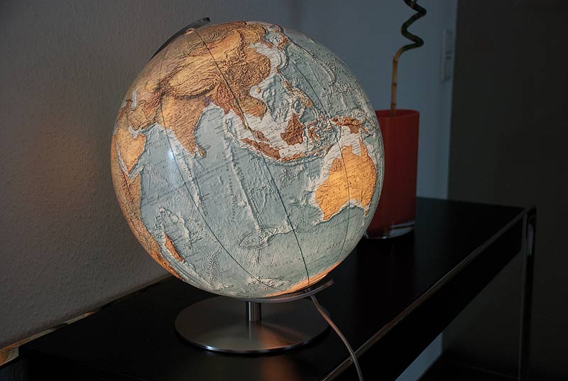 Globe van acrylglas met een diameter van 34 cm. Mooie voet en meridiaan van edelstaal. Externe kabel via de meridiaan. Engelse tekst. (De jury van de toonaangevende Paperworld beurs in Frankfurt heeft deze globe een award toegekend vanwege haar klassieke, tijdloze elegantie gekoppeld aan een moderne uitstraling.)