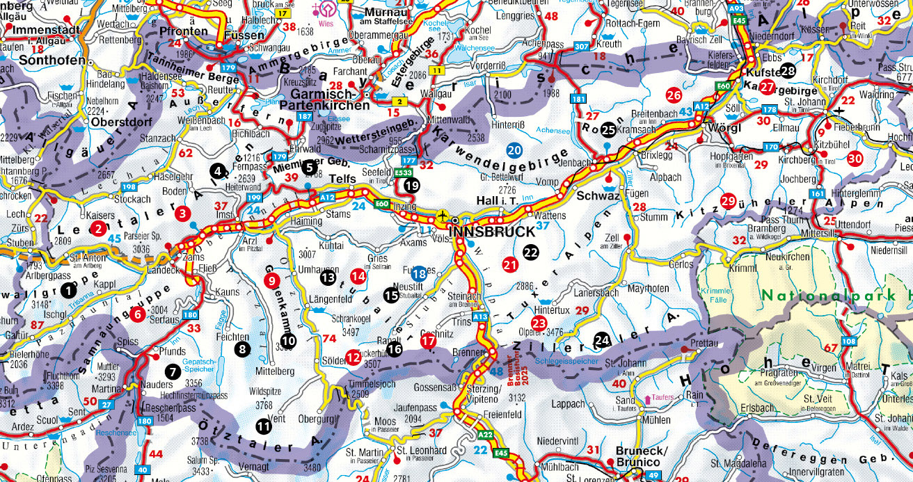 Het beschreven gebied strekt zich uit van de Arlberg tot aan het laagland en omvat de enorme diversiteit van de Lechtal-, Ötztal- en Stubaier Alpen. Het brengt u ook naar de hoogalpiene gebieden op de hoofdkam van de Alpen, waar u tijdens spannende beklimmingen een hoogte van meer dan 3000 meter kunt bereiken. Talrijke tochten spreken de ambitieuze bergliefhebber aan, maar er zijn ook enkele gemakkelijkere, zoals een wandeling door de Karwendel. De rondwandelingen zijn in een tijdsbestek van twee tot maximaal vier dagen te doen.