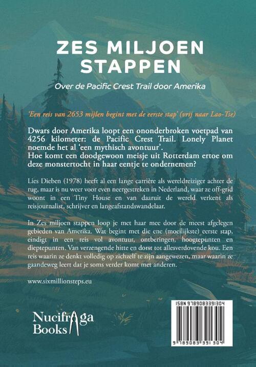 ‘Een reis van 2653 mijlen begint met de eerste stap’ (vrij naar Lao-Tse)Dwars door Amerika loopt een ononderbroken voetpad van 4256 kilometer: de Pacific Crest Trail. Lonely Planet noemde het al ‘een mythisch avontuur’.Hoe komt een doodgewoon meisje uit Rotterdam ertoe om deze monstertocht in haar eentje te ondernemen?Lies Dieben (1978) heeft al een lange carrière als wereldreiziger achter de rug, maar is nu weer voor even neergestreken in Nederland, waar ze off-grid woont in een Tiny House en van daaruit de wereld verkent als reisjournalist, schrijver en langeafstandswandelaar.In Zes miljoen stappen loop je met haar mee door de meest afgelegen gebieden van Amerika. Wat begint met die ene (moeilijkste) eerste stap, eindigt in een reis vol avontuur, ontberingen, hoogtepunten en dieptepunten. Van verzengende hitte en dorst tot allesverdovende kou. Een reis waarin ze denkt volledig op zichzelf te zijn aangewezen, maar waarin ze gaandeweg leert dat je soms verder komt met anderen.www.sixmillionsteps.eu